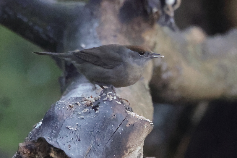 Mildere vintre betyder, at flere fuglearter, som tidligere trak sydpå, nu vælger at blive hos os. Forudsætningen er dog, at der er føde nok. Her har en hun-munk fundet et kreativt foderbræt – en grenstump med små fordybninger fyldt med foder.