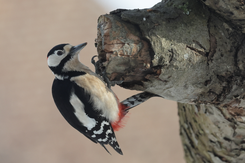 Stor flagspætte han fandt en grenstump der er råd i og brugte betragtelig tid på at pille dybt inde i grenstumpen. Le mâle du grand pic épeiche a trouvé un morceau de branche pourrie et a passé un temps considérable à fouiller profondément à l’intérieur.